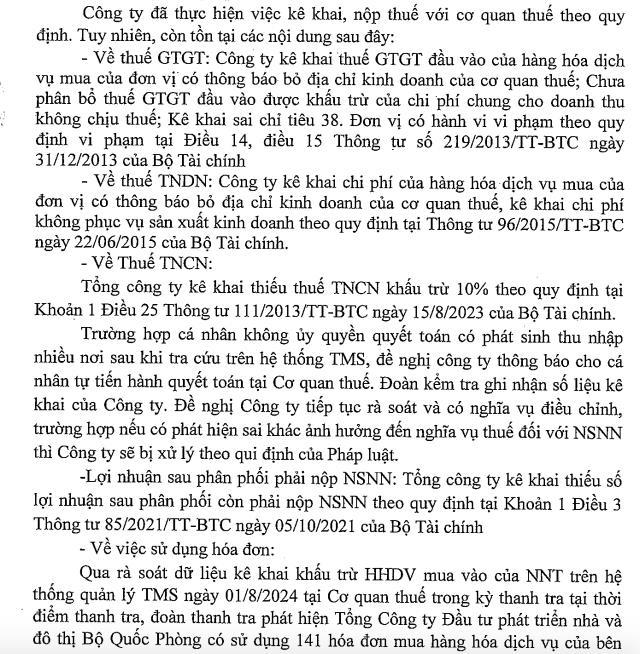 Qua ra soát dữ liệu kê khai khấu trừ hàng hoá dịch vụ mua vào của người nộp thuế trên hệ thống quản lý TMS ngày 01/8/2024 tại cơ quan thuế trong kỳ thanh tra tại thời điểm thanh tra, đoàn thanh tra phát hiện Tổng công ty Đầu tư phát triển nhà và đô thị Bộ Quốc Phòng sử dụng 141 hóa đơn mua hàng hoá dịch vụ của bên bán có thông báo bỏ địa chỉ kinh doanh của cơ quan thuế (phát sinh trước ngày thông báo của cơ quan thuế), tổng giá trị hàng hoá dịch vụ mua vào là 28,68 tỷ đồng, tiền thuế GTGT là 2,8 tỷ đồng. Các hóa đơn này phát hành trước thời điểm bên bán bỏ địa chỉ kinh doanh.