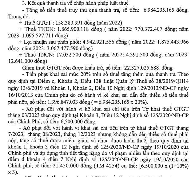 Kết luận thanh tra chỉ rõ, công ty đã thực hiện việc kê khai, nộp thuế với cơ quan thuế theo quy định. Tuy nhiên vẫn còn tồn tại một vài nội dung sau. Cụ thể, về thuế GTGT, công ty kê khai thuế GTGT đầu vào của hàng hóa dịch vụ mua của đơn vị có thông báo bỏ địa chỉ kinh doanh của cơ quan thuế, chưa phân bổ thuế GTGT đầu vào được khấu trừ của chi phí chung cho doanh thu không chịu thuế.