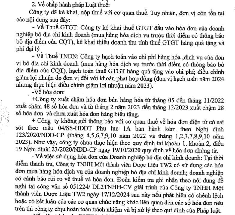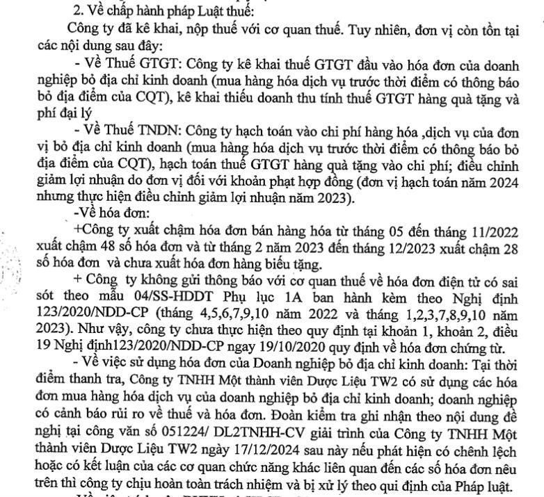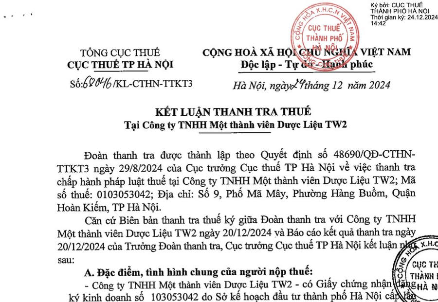 Ngày 24/12/2024, Cục thuế TP Hà Nội (Tổng cục thuế) công bố kết luận thanh tra thuế tại Công ty TNHH Một thành viên Dược liệu TW2, có địa chỉ tại 9 phố Mã Mây, phường Hàng Buồm, quận Hoàn Kiếm, Hà Nội.