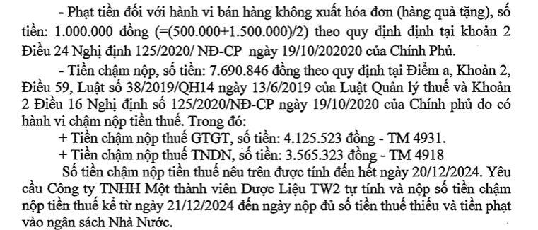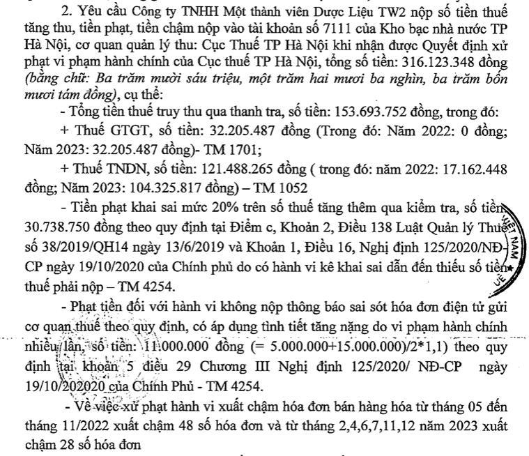 Với những sai phạm trên, Cục thuế Hà Nội yêu cầu công ty TNHH MTV Dược liệu TW2 chấn chỉnh ngay những sai phạm, đồng thời nộp số tiền thuế tăng thu, tiền phạt, tiền chậm nộp vào Kho bạc nhà nước TP Hà Nội số tiền là hơn 316,1 triệu đồng.