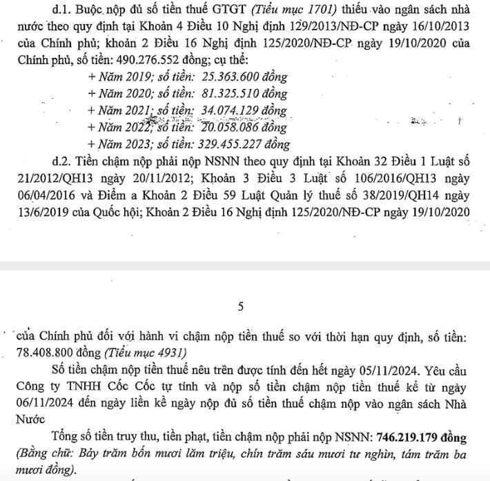 Với các hành vi vi phạm trên, tổng số tiền mà Công ty TNHH Cốc Cốc bị kiến nghị truy thu, xử phạt, buộc nộp tiền chậm nộp phải nộp ngân sách Nhà nước là hơn 746,2 triệu đồng.