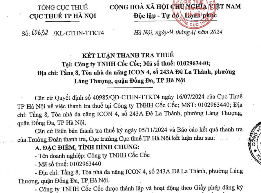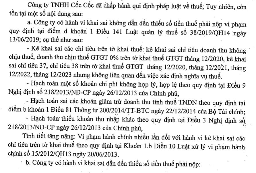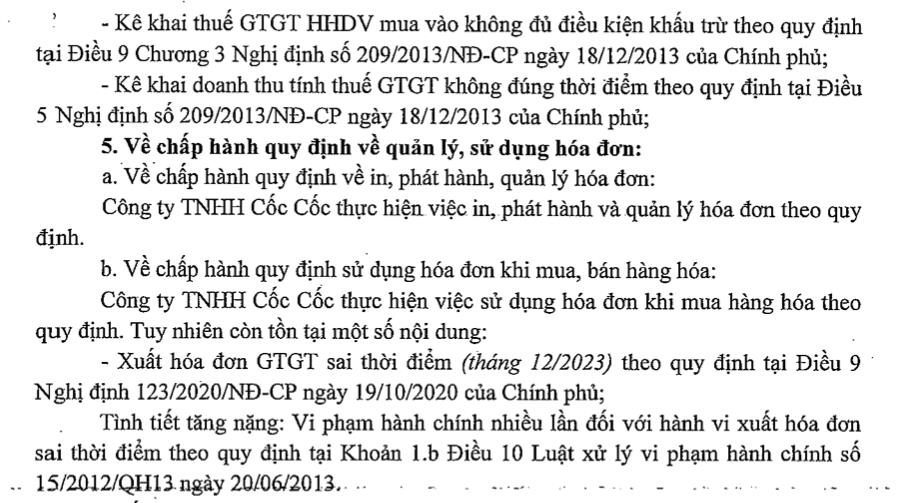 Về việc chấp hành quy định sử dụng hóa đơn khi mua, bán hàng hóa, kết luận thanh tra còn chỉ rõ, công ty TNHH Cốc Cốc đã xuất hóa đơn giá trị gia tăng sai thời điểm (tháng 12/2023) theo quy định tại điều 9/nghị định 123/2020/NĐ-CP ngày 19/10/2020 của Chính phủ, với tình tiết tăng nặng do vi phạm nhiều lần.