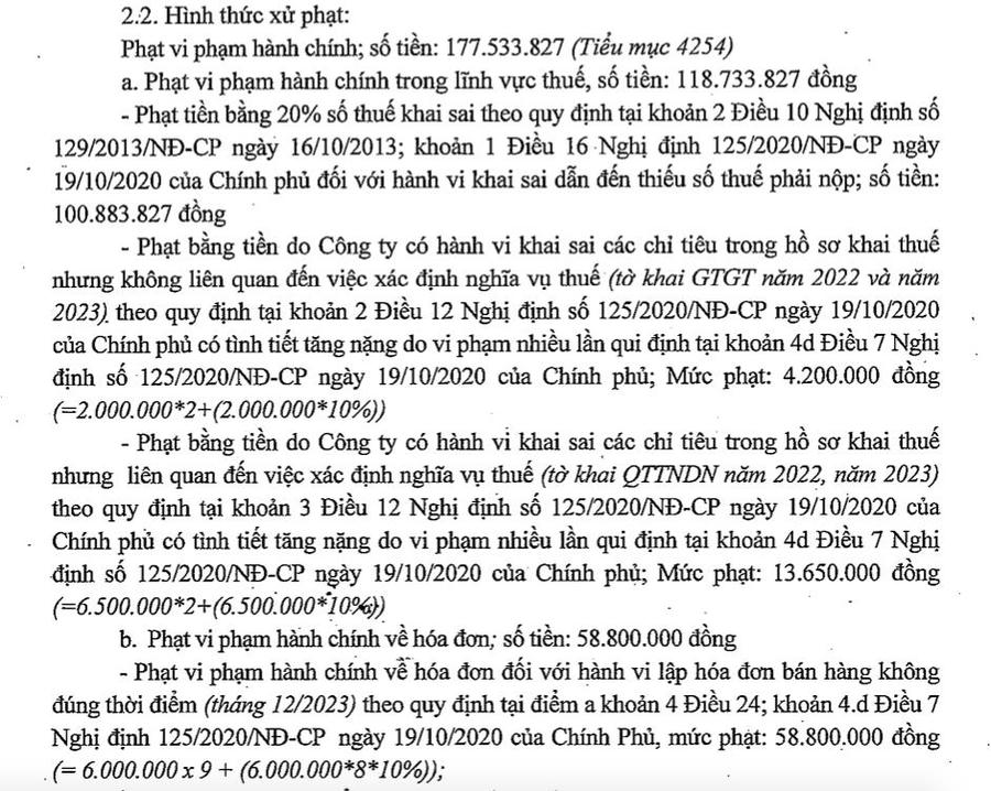 Cụ thể, Công ty kê khai sai các chỉ tiêu trên tờ khai thuế, kê khai sai chỉ tiêu doanh thu không chịu thuế, doanh thu chịu thuế giá trị gia tăng 0% trên tờ khai thuế giá trị gia tăng tháng 12/2020, kê khai sai chỉ tiêu 37, chỉ tiêu 38 trên tờ khai thuế giá trị gia tăng tháng 12 của các năm 2020, 2021, 2022 và 2023 nhưng không liên quan đến việc xác định nghĩa vụ thuế. Công ty cũng hạch toán một số khoản chi phí không hợp lý, hợp lệ theo quy định tại Điều 9, Nghị định 218/2023/NĐ-CP ngày 26/12/2013 của Chính phủ.