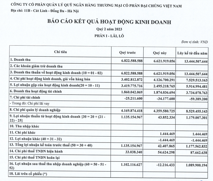 Lũy kế 6 tháng đầu năm, PVCB Capital doanh thu đạt 13,4 tỷ đồng, lãi sau thuế 1,08 tỷ đồng. Theo giải trình của công ty, nguyên nhân chủ yếu là do ảnh hưởng chung của thị trường, việc huy động nguồn vốn đầu tư từ các tổ chức và khách hàng cá nhân mới gặp rất nhiều khó khăn, nên doanh thu từ hoạt động quản lý danh mục bị giảm đáng kể so với cùng kỳ.