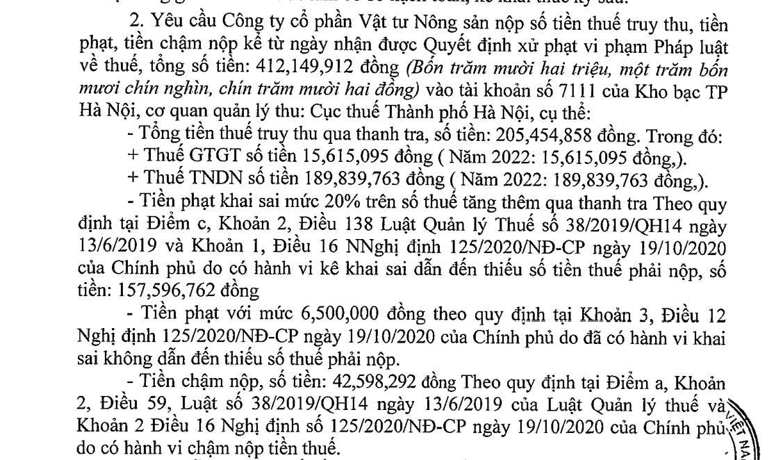 Cơ quan thanh tra yêu cầu CTCP Vật tư Nông sản nộp số tiền thuế truy thu, tiền phạt, tiền chậm nộp kể từ ngày nhận được Quyết định xử phạt vi phạm Pháp luật về thuế, tổng số tiền hơn 412 triệu đồng.