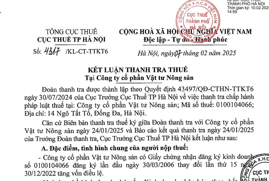 Cục Thuế TP Hà Nội (nay là Chi cục Thuế khu vực I) đã ban hành Kết luận thanh tra số 4317/KL-CT-TTKT6, ngày 07/2/2025 với CTCP Vật tư Nông sản, địa chỉ 14 Ngô Tất Tố, Đống Đa, Hà Nội.