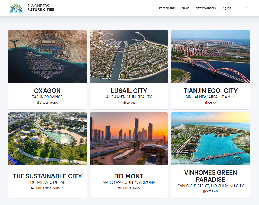 Trong danh sách đề cử sơ bộ, không khó để nhận ra những biểu tượng đô thị thông minh, bền vững đương đại: Tianjin Eco-City (Trung Quốc), The Sustainable City (Dubai), Oxagon (Ả rập Xê-út), Lusail City (Qatar), Belmont (Mỹ)…