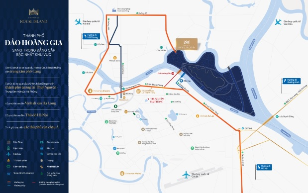 Sức hút của Thành phố đảo Hoàng gia còn đến từ vị trí hoàng kim của dự án tại tâm điểm của những tuyến giao thông huyết mạch với kết nối “không - thủy - bộ” đồng bộ nhất Việt Nam - kế cận 1 quốc lộ, 2 cao tốc hiện đại, 3 sân bay quốc tế cùng cụm cảng cửa ngõ ra biển lớn nhất miền Bắc. Nhờ đó, cư dân chỉ mất 5 phút để kết nối ngay đến thành phố tương lai Thuỷ Nguyên - trung tâm mới của Hải Phòng; chỉ 10 phút là đến giữa trung tâm thành phố Cảng náo nhiệt; 40 phút để đến Vịnh di sản Hạ Long; 60 phút để đến Thủ đô Hà Nội; và 2 - 4 giờ bay để đến các thủ phủ của châu Á như Thái Lan, Hàn Quốc, Trung Quốc, Nhật Bản…