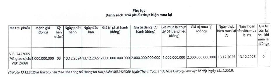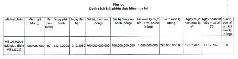 Ngày 12/12/2025, VIB cũng đã tất toán sớm lô trái phiếu mã VIBL2330005 (mã giao dịch VIB12322) cũng với giá trị thực tế mua lại 1 tỷ đồng/trái phiếu, tổng giá trị mua lại 790 tỷ đồng.
