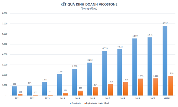 Năm 2021, Vicostone đặt kế hoạch doanh thu thuần hợp nhất 6.797 tỷ đồng, lợi nhuận trước thuế 1.919 tỷ đồng; tăng trưởng lần lượt 20,1% và 15,1% so với năm ngoái. Nếu loại trừ điều chỉnh do ảnh hưởng của Covid-19, đây sẽ là năm thứ 9 tăng trưởng liên tiếp của Vicostone.