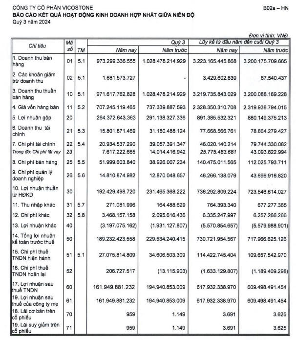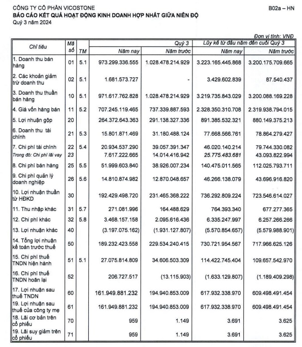 Lũy kế 9 tháng đầu năm, Vicostone ghi nhận tăng trưởng với doanh thu và lợi nhuận trước thuế lần lượt là 3.219,7 tỷ đồng và 730,72 tỷ đồng, tăng nhẹ so với cùng kỳ năm ngoái. Với kết quả đạt được này, khép lại 9 tháng đầu năm, công ty đạt 70% và 71% so với kế hoạch năm.