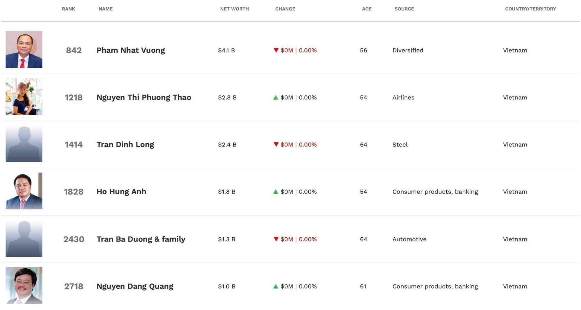 Theo cập nhật mới nhất từ Forbes, Việt Nam hiện có 6 tỷ phú USD khi ông Nguyễn Đăng Quang - Chủ tịch Masan Group trở lại danh sách này. Trước đó, vào cuối năm ngoái ông Quang đã rớt khỏi danh sách.