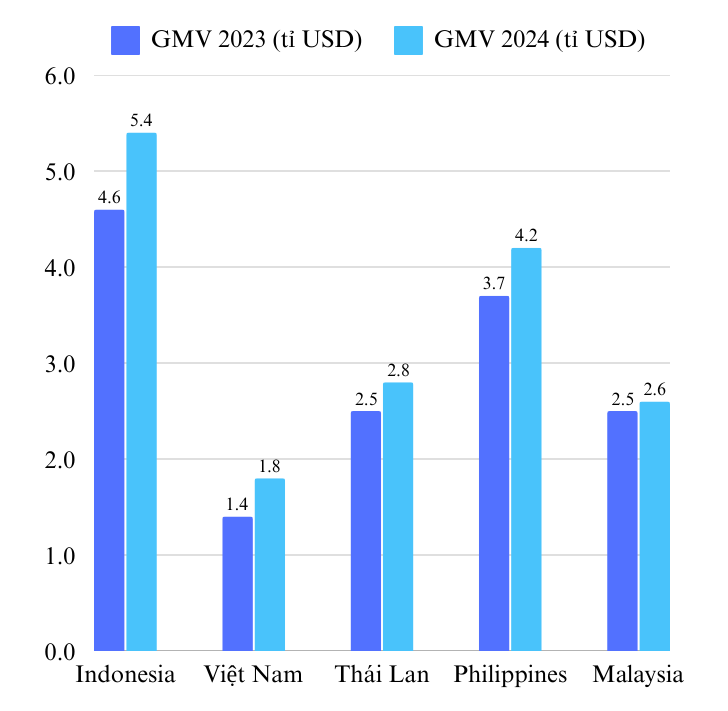 Indonesia theo sát Việt Nam với mức tăng trưởng GMV 18%, nhờ vào nỗ lực mở rộng của các nền tảng lớn như Grab, Gojek và ShopeeFood.