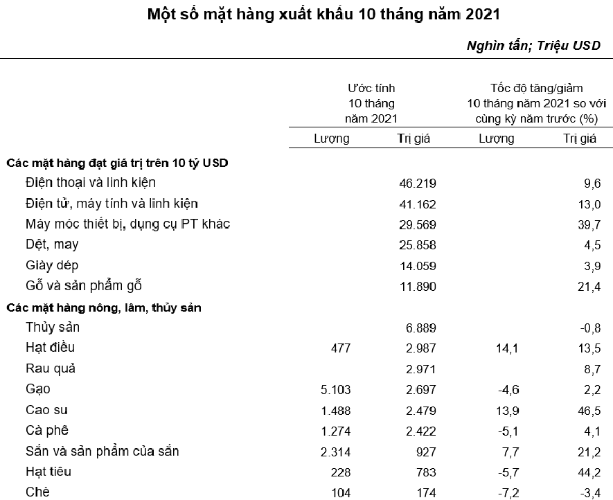 Về kim ngạch nhập khẩu hàng hóa 10 tháng đầu năm đạt 269,3 tỷ USD, tăng 28,2% so với cùng kỳ.