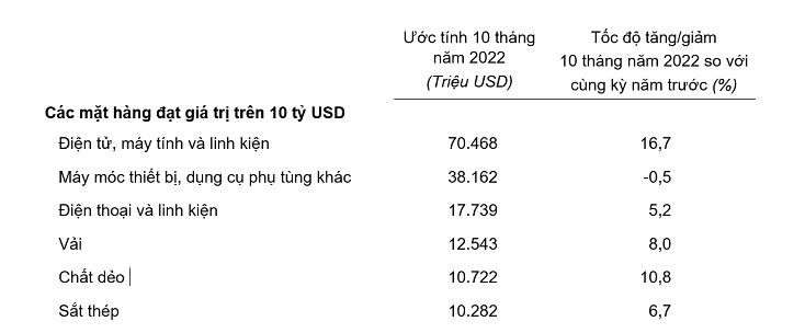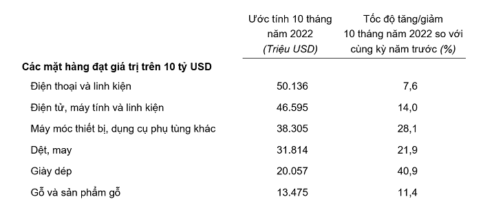 Tổng kim ngạch xuất nhập khẩu 10 tháng năm 2022 đạt 616,24 tỷ USD, trong đó xuất khẩu đạt 312,82 tỷ USD và nhập khẩu đạt 303,42 tỷ USD.