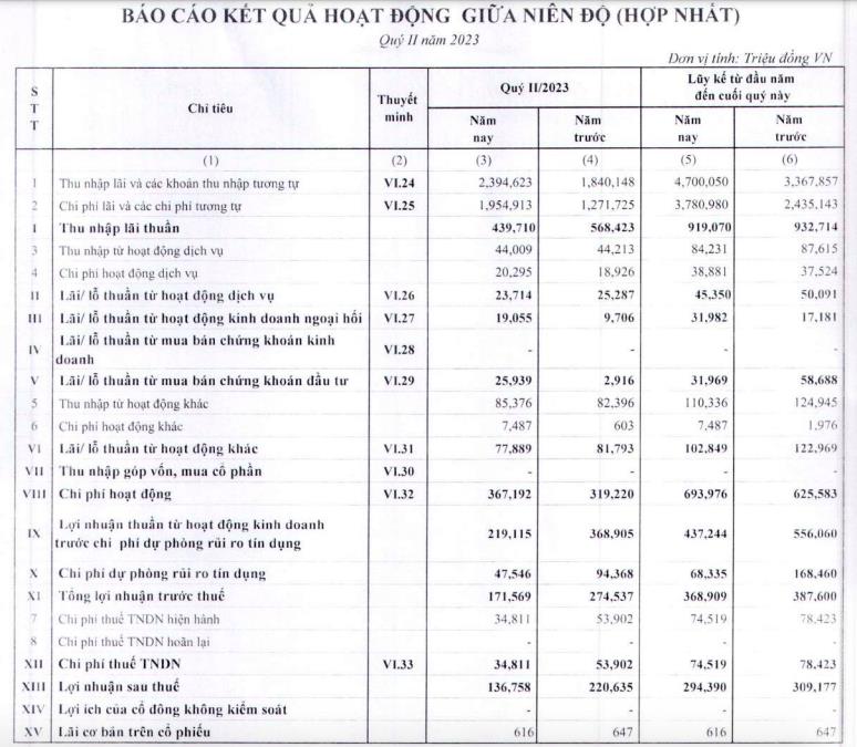 Lũy kế 6 tháng đầu năm 2023, ngân hàng VBB lãi sau thuế 294,3 tỷ đồng, giảm nhẹ so với con số 309,1 tỷ đồng ở cùng kỳ. Thu nhập lãi thuần giảm về 919 tỷ đồng so với 932 tỷ đồng ghi nhận ở cùng kỳ năm ngoái.