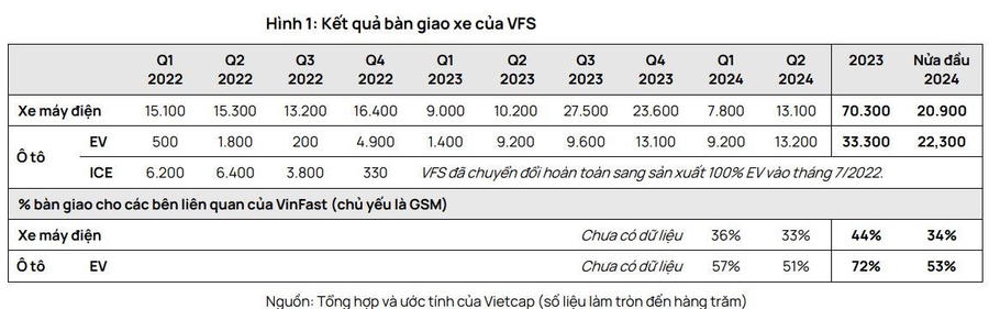 Ghi nhận từ cuộc họp báo cáo KQKD quý 2/2024 của VinFast (Nasdaq: VFS) tổ chức vào ngày 20/9, Chứng khoán Vietcap cho biết ban lãnh đạo VinFast vẫn duy trì kế hoạch bàn giao 80.000 ô tô điện trong năm 2024, nhờ vào danh mục mẫu xe đa dạng, tiếp cận nhiều thị trường và các kế hoạch kinh doanh đang triển khai.