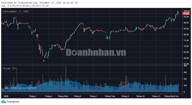 Sau giai đoạn phục hồi nhanh và mạnh từ vùng đáy hồi cuối tháng 3, cổ phiếu VCB bắt đầu có dấu hiệu “hụt hơi” và gần như đi ngang kể từ trung tuần tháng 6. Đến giữa tháng 11, cổ phiếu này bất ngờ trở lại đường đua khi liên tục leo dốc qua đó đạt đỉnh lịch sử (tính theo giá điều chỉnh) 99.900 đồng/cổ phiếu ngày 14/12.