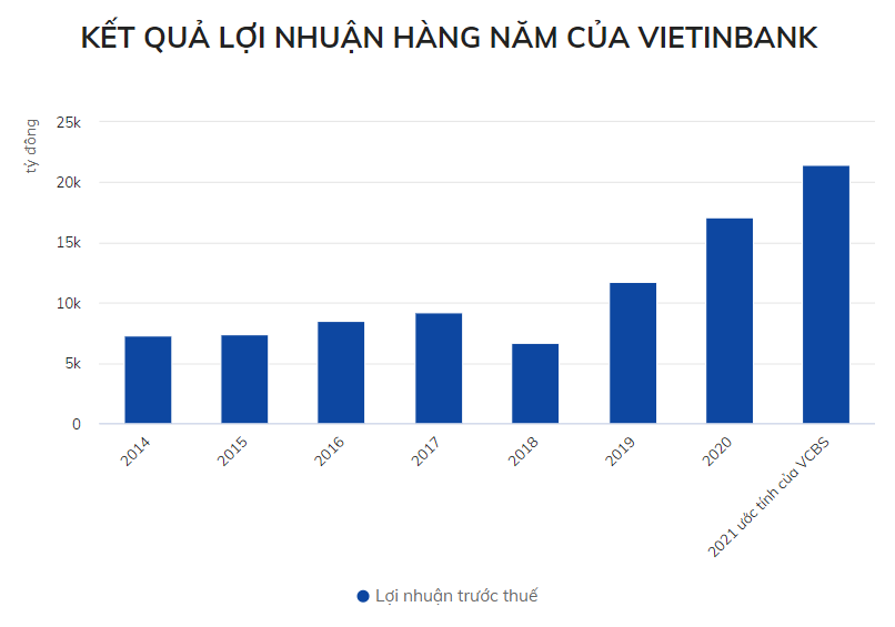 Theo VCSC, hiện VietinBank chưa công bố kế hoạch lợi nhuận trước thuế năm 2021 cụ thể do đang phải chờ phê duyệt của cơ quan quản lý. Tuy nhiên, kế hoạch sơ bộ của ban lãnh đạo ngân hàng là lợi nhuận sẽ tăng 16-18% so với số thực thu năm 2020, tương đương gần 20.000 tỷ đồng.