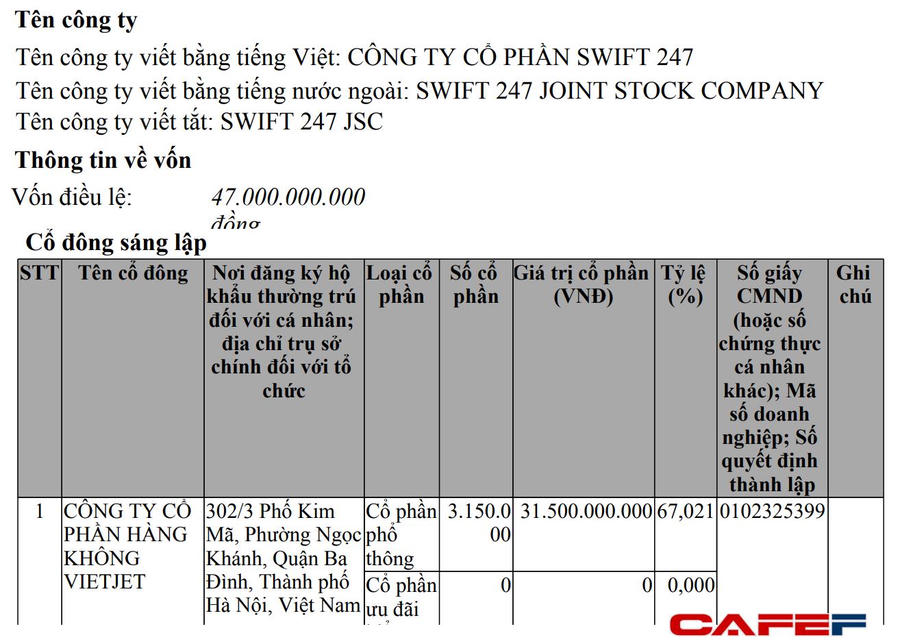 Trong lần thay đổi đăng ký kinh doanh vào ngày 4/11/2020, vốn điều lệ của Swift 247 được tăng lên 47 tỷ đồng. Công ty cũng chuyển từ mô hình Công ty TNHH sang công ty cổ phần trong đó Vietjet là cổ đông chi phối nắm 67% vốn. Ông Hà Năng Việt – cổ đông chính của Swift 247 tại thời điểm thành lập và hiện giữ vị trí Tổng giám đốc nắm 26% vốn.