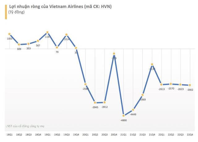 Dù doanh thu năm 2022 phục hồi bằng hai năm dịch cộng lại, Vietnam Airlines vẫn lỗ hơn 10.000 tỷ đồng do giá nhiên liệu, tỷ giá biến động mạnh. Đây là quý thua lỗ thứ 12 liên tiếp của Vietnam Airlines.