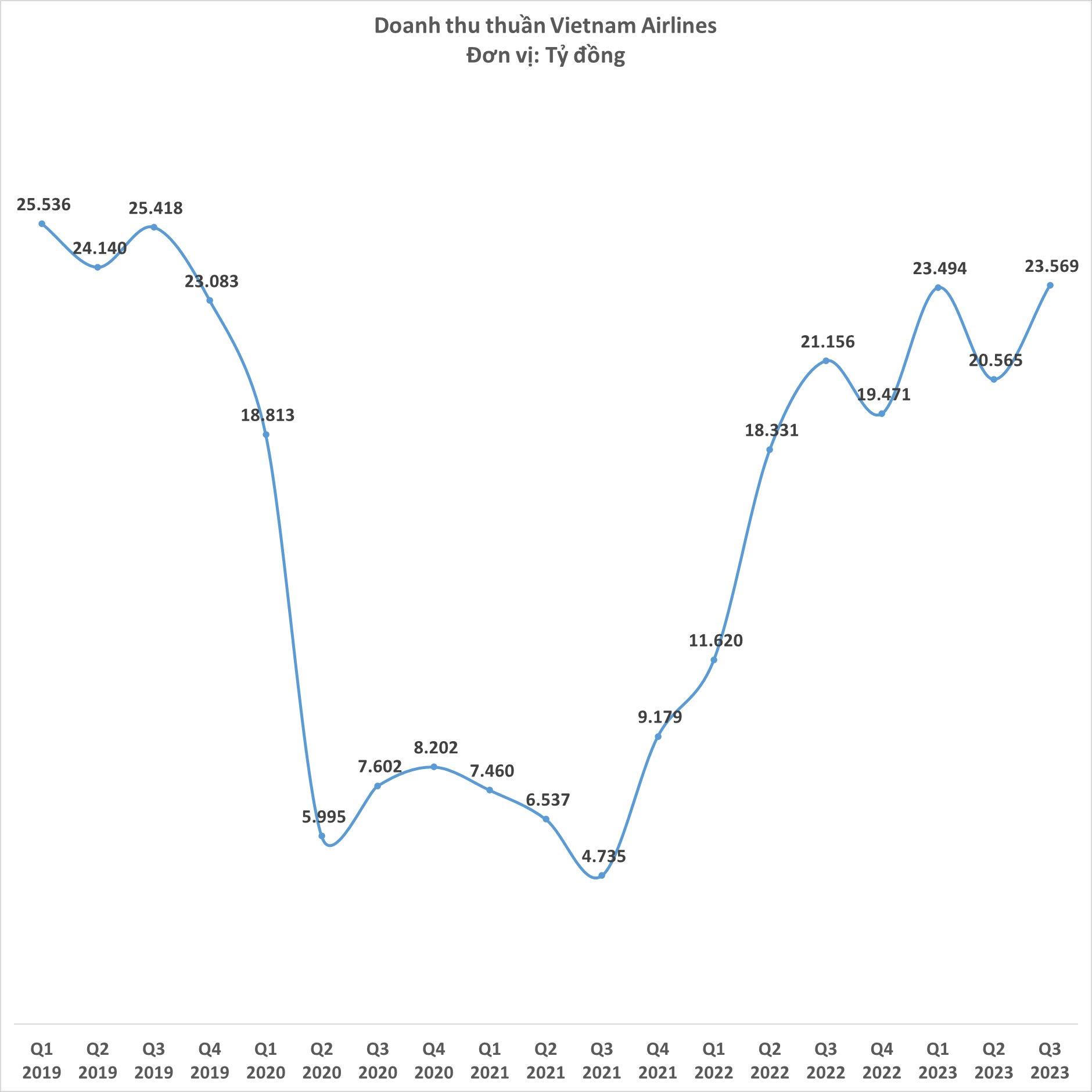Lũy kế 9 tháng, Vietnam Airlines đạt doanh thu thuần 67.628 tỷ đồng và lỗ sau thuế 3.534 tỷ đồng. Doanh thu tăng 32% và số lỗ giảm hơn một nửa so với 9 tháng 2022.
