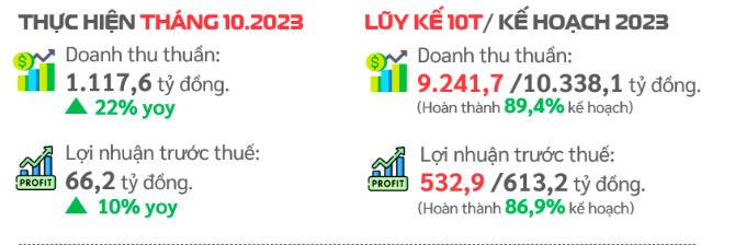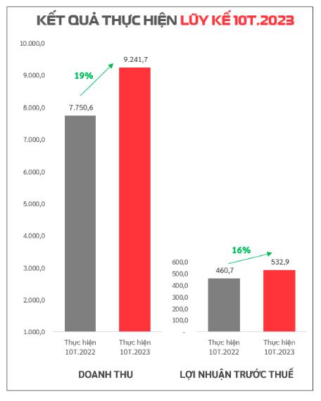 Luỹ kế 10 tháng đầu năm, doanh thu công ty đạt 9.241,7 tỷ đồng, tăng 19% so với cùng kỳ, đạt 89% kế hoạch năm. Lợi nhuận trước thuế 533 tỷ đồng, tăng 16% so với cùng kỳ, tương đương thực hiện 87% chỉ tiêu năm.