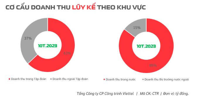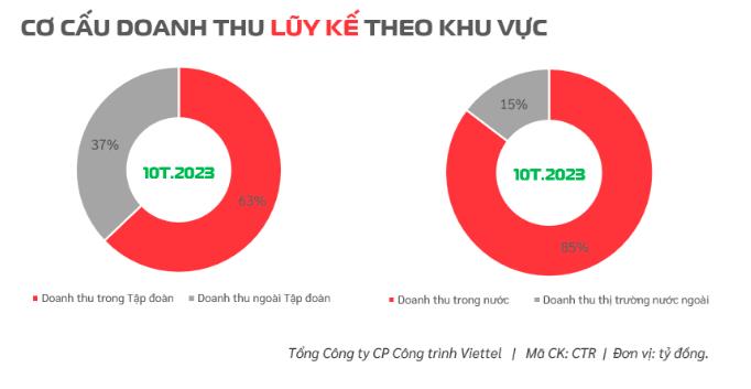 Tính theo khu vực, doanh thu của Viettel Construction đến từ thị trường trong nước chiếm 85% với 7.856 tỷ đồng. Thị trường nước ngoài chỉ đóng góp 15% với 1.386 tỷ đồng.