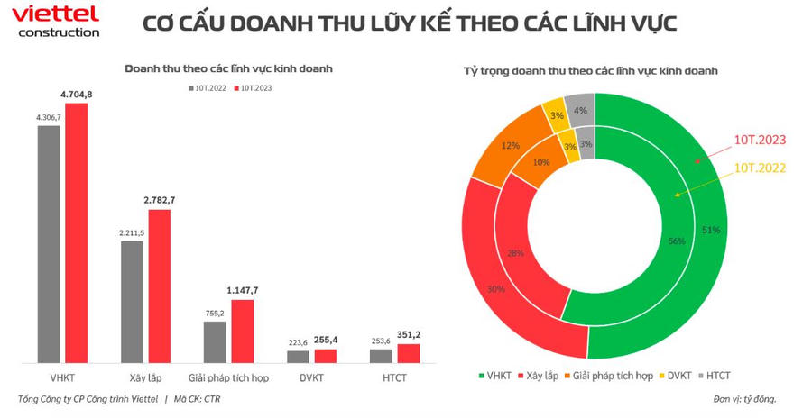 Tính chung 10 tháng đầu năm 2023, vận hành khai thác là mảng đóng góp nhiều nhất (chiếm 51%) vào doanh thu Viettel Construction với 4.705 tỷ đồng, tăng 9% so với cùng kỳ. Tiếp theo là mảng xây lắp với 2.783 tỷ đồng, chiếm 30% doanh thu, tăng 26% so với cùng kỳ.