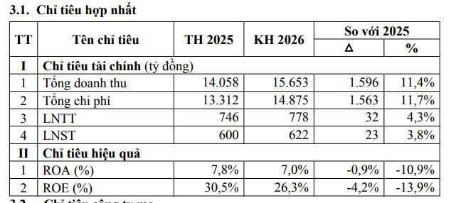 Theo tờ trình của HĐQT, doanh nghiệp đặt kế hoạch doanh thu hợp nhất năm 2026 đạt trên 15.653 tỷ đồng, tăng hơn 11% so với thực hiện năm 2025. Lợi nhuận sau thuế dự kiến đạt 622 tỷ đồng, tăng gần 4%.