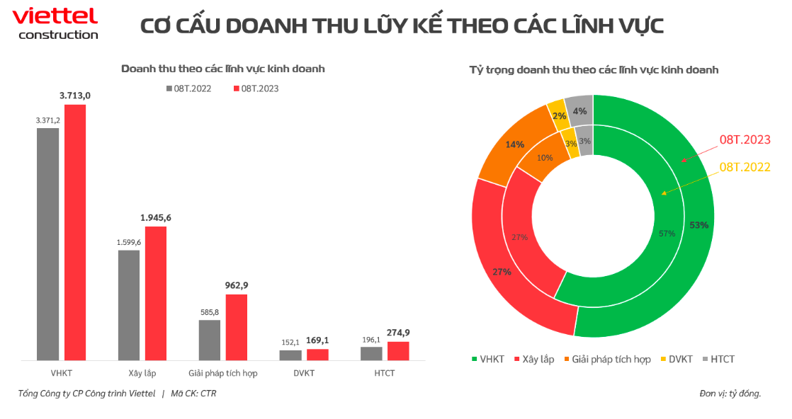 Trong 8 tháng đầu năm, vận hành khai thác là mảng đóng góp nhiều nhất vào doanh thu Viettel Construction (53%) với 3.713 tỷ đồng, tăng 10% so với cùng kỳ. Tuy nhiên, so với 8 tháng năm 2022, doanh thu hoạt động khai thác đóng góp ít hơn 4%.
