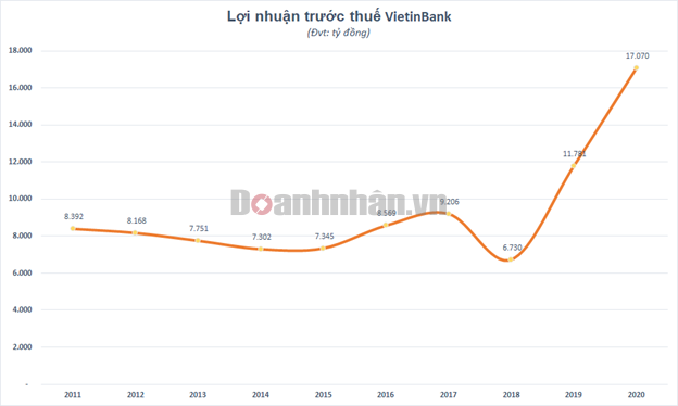 Theo báo cáo tài chính hợp nhất quý IV, Ngân hàng Công thương Việt Nam (VietinBank – mã CK: CTG) ghi nhận lợi nhuận trước thuế năm 2020 đạt 17.070 tỷ đồng, tăng 45% so với năm trước nhờ động lực chủ yếu đến từ các mảng hoạt động phi tín dụng. Đây cũng là mức lợi nhuận trước thuế cao nhất nhà băng này đạt được kể từ khi hoạt động.