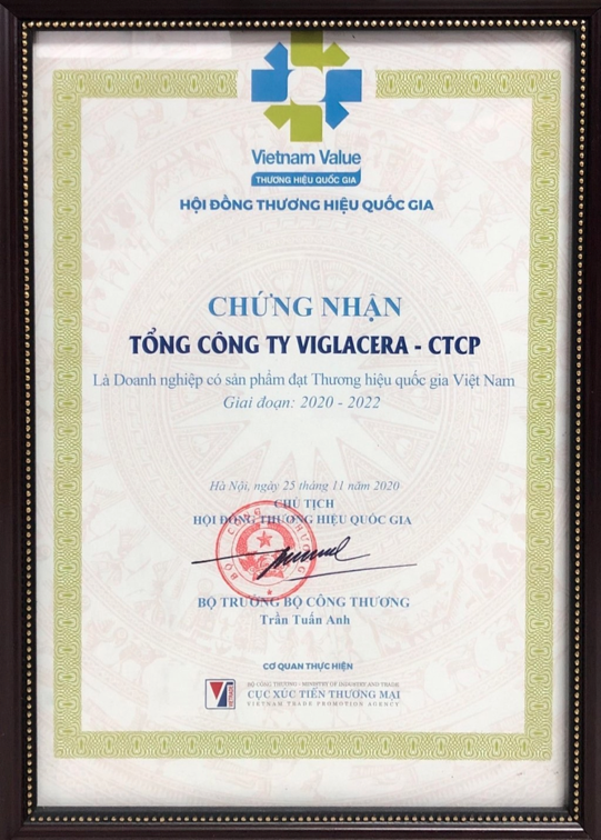 Vào cuối tháng 11 vừa qua, Tổng Công ty Viglacera - CTCP đã vinh dự đón nhận “Thương hiệu Quốc gia năm 2020”. Đây là chương trình duy nhất của Chính phủ Việt Nam tiến hành với mục đích quảng bá hình ảnh, thương hiệu quốc gia thông qua thương hiệu sản phẩm.