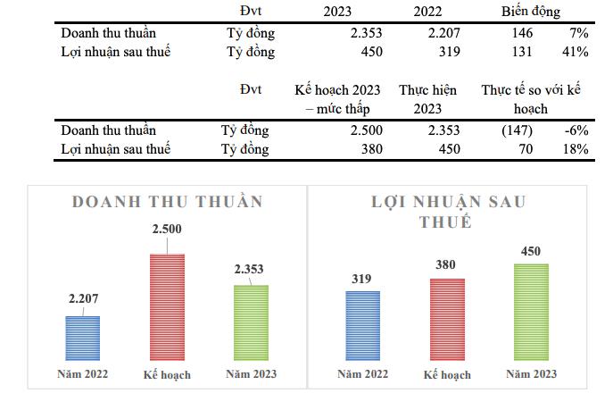 Nhìn lại năm 2023, công ty đạt doanh thu 2.353 tỷ đồng, tăng 7% so với cùng kỳ và đạt 94% kế hoạch năm ở mức thấp. Lợi nhuận sau thuế của VCF ghi nhận tại 450 tỷ đồng, tăng 41% so với năm 2022 và đạt 118% kế hoạch năm ở mức thấp.