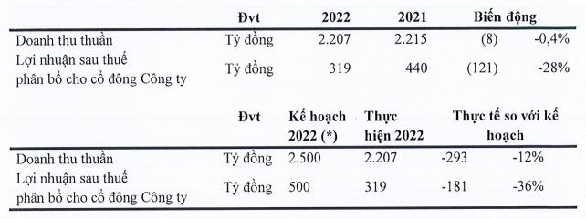 Điểm lại kết quả kinh doanh năm 2022, doanh thu thuần và lãi ròng lần lượt đạt 2,207 tỷ đồng và 319 tỷ đồng, giảm 0.4% và 28% so với năm 2021. Đồng thời, Công ty không hoàn thành kế hoạch (ở mức thấp), doanh thu thực hiện được 88% và lãi ròng thực hiện được 64% kế hoạch năm 2022.