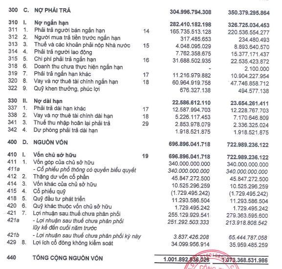Vốn chủ sở hữu tính đến cuối quý II/2024 đạt 696,8 tỷ đồng, giảm 3,5% so với đầu năm. Lợi nhuận sau thuế chưa phân phối đạt 255,1 tỷ đồng.