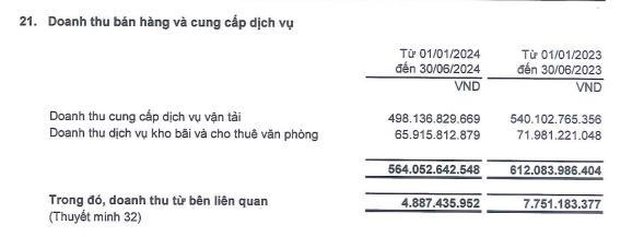 Trong cơ cấu, doanh thu cung cấp dịch vụ vận tải đạt 498 tỷ đồng, doanh thu dịch vụ kho bãi và cho thuê văn phòng đạt 65,9 tỷ đồng, đều thấp hơn so với nửa đầu năm 2023.