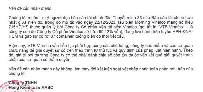 Liên quan đến vụ việc trên, trong báo cáo tài chính hợp nhất bán niên đã được kiểm toán năm 2024 của Công ty cổ phần Vinafco (mã ck: VFC - công ty mẹ sở hữu trên 90% vốn của Công ty cổ phần Vận tải biển Vinafco), Công ty TNHH Kiểm toán AASC - đơn vị kiểm toán báo cáo tài chính của Vinafco nêu vấn đề cần nhấn mạnh. Cụ thể, vào ngày 22/12/2023, tàu biển Morning Vinafco mang số hiệu 715HD/HS thuộc quản lý bởi Công ty Cổ phần Vận tải biển Vinafco (gọi tắt là VTB Vinafco - là công ty con do Công ty cổ phần Vinafco sở hữu 90,12% vốn), đang lưu hành trên tuyến HPH-ĐNA-HCM gặp sự số rơi 37 container xuống biển do thời tiết xấu.