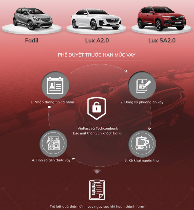 Hiện tại, hình thức thẩm định vay trực tuyến được áp dụng cho cả 3 mẫu ô tô đang phân phối của VinFast là Fadil, Lux A2.0 và Lux SA2.0 và chương trình "Bảo lãnh lãi suất vượt trội" được VinFast áp dụng cho 2 dòng xe Lux.