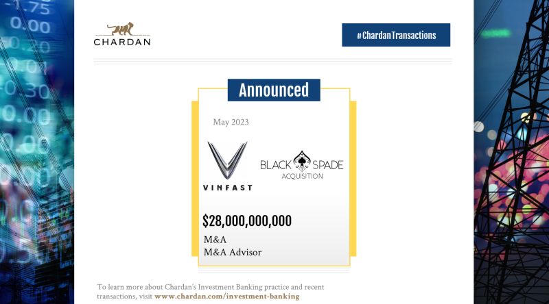 Ở thương vụ hợp nhất của VinFast và Black Spade, cố vấn sáp nhập và mua lại cho VinFast là Chardan Capital Markets, LLC (Chardan) và cố vấn tài chính cho Black Spade là Jones Trading Institutional Services.