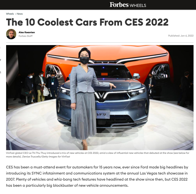 Bài viết “10 chiếc xe tuyệt vời nhất tại CES 2022” (The 10 Coolest Cars From CES 2022) đăng tải trên Forbes sử dụng ảnh lớn của bà Lê Thị Thu Thủy, Phó Chủ tịch Vingroup kiêm Tổng Giám đốc VinFast Toàn cầu, cạnh mẫu ô tô điện Made in Vietnam tại Las Vegas.