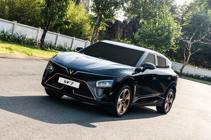 VF 7 Dragon Forged thu hút ánh nhìn với màu sơn đen tuyền, kết hợp cùng các chi tiết màu vàng sang trọng ở la-zăng, logo chữ V và đường viền ở mặt ca-lăng, đuôi xe. Sự hoà quyện ăn nhập giữa hai tone màu còn mang đến cảm giác thời thượng, cao cấp.