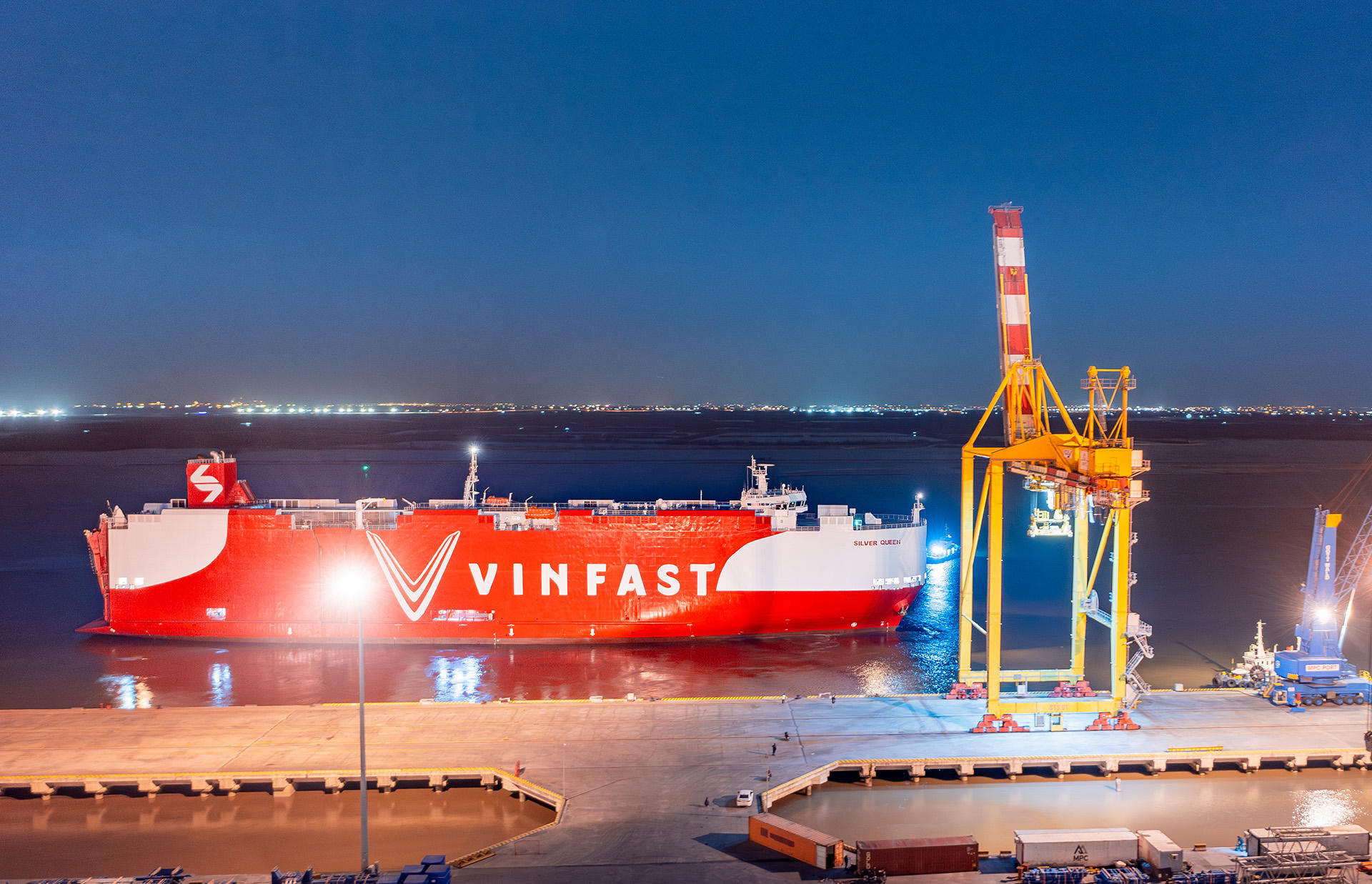 Tàu Silver Queen trong diện mạo mới với toàn thân sơn màu đỏ, cùng logo và dòng chữ VinFast màu trắng cỡ lớn chạy dọc thân tàu, đã có mặt tại cảng Mipec (Hải Phòng) từ ngày 04/03/2025. Sau khi tiếp nhận gần 2.500 ô tô điện VinFast, tàu đã chính thức rời cảng vào tối 08/03/2025 để xuất khẩu xe tới thị trường Indonesia.
