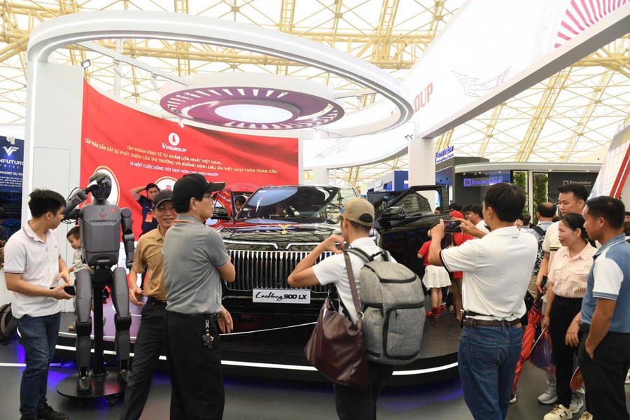 Khu triển lãm được bắt đầu từ VinFast – biểu tượng của tinh thần “Cùng bạn bứt phá mọi giới hạn” với thiết kế xuyên suốt hình chữ V tượng trưng cho Việt Nam – VinFast – Victory. Lần đầu tiên, khách tham quan sẽ được chiêm ngưỡng trọn vẹn dải sản phẩm xe điện của hãng, từ dòng xe đô thị nhỏ gọn như VF 3, các dòng SUV đẳng cấp như VF 9 đến mẫu xe bán tải điện VF Wild hay dòng xe máy điện hiện đại. Cũng lần đầu tiên, người dân được “mục sở thị” mẫu xe chống đạn Lạc Hồng 900 LX, đạt tiêu chuẩn VPAM VR7, đảm bảo khả năng chống lại các loại đạn súng trường NATO Ball M80 và lựu đạn loại DM51 – được sản xuất giới hạn dành cho Nguyên thủ và các yếu nhân. Bên cạnh đó, nơi đây còn trưng bày cánh tay robot có khả năng tự động gắp/đặt đồ vật một cách linh hoạt, cùng dàn robot VinMotion với sân khấu trình diễn hào hùng, đi kèm những bước di chuyển linh hoạt, mạnh mẽ.