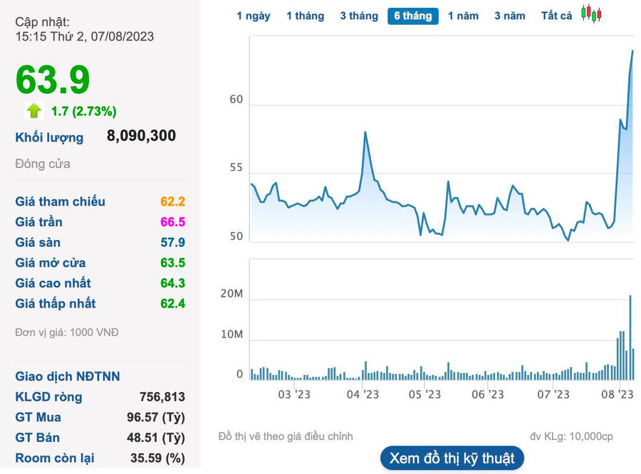 Trên thị trường, cổ phiếu VIC đang giao dịch đầy khởi sắc thời gian gần đây. Chỉ sau 6 phiên giao dịch, thị giá VIC đã tăng 24% qua đó leo lên mức 63.900 đồng/cp, cao nhất trong vòng 8 tháng. Vốn hóa thị trường tương ứng tăng thêm gần 47.300 tỷ đồng (~2 tỷ USD) lên mức 243.700 tỷ đồng.