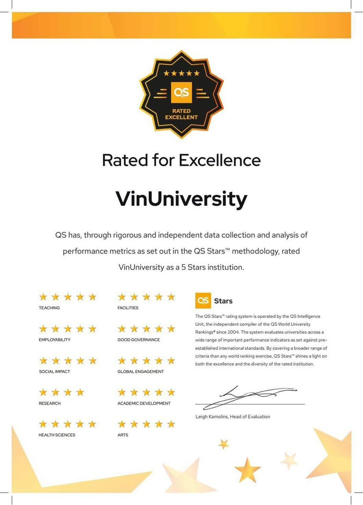 Ngày 23/9/2024, Tổ chức xếp hạng giáo dục uy tín hàng đầu thế giới QS - Quacquarelli Symonds (Anh Quốc) công bố VinUni đã đạt chứng nhận QS 5 Sao toàn diện, trở thành trường đại học trẻ nhất thế giới đạt được danh hiệu danh giá trên trong lịch sử QS.