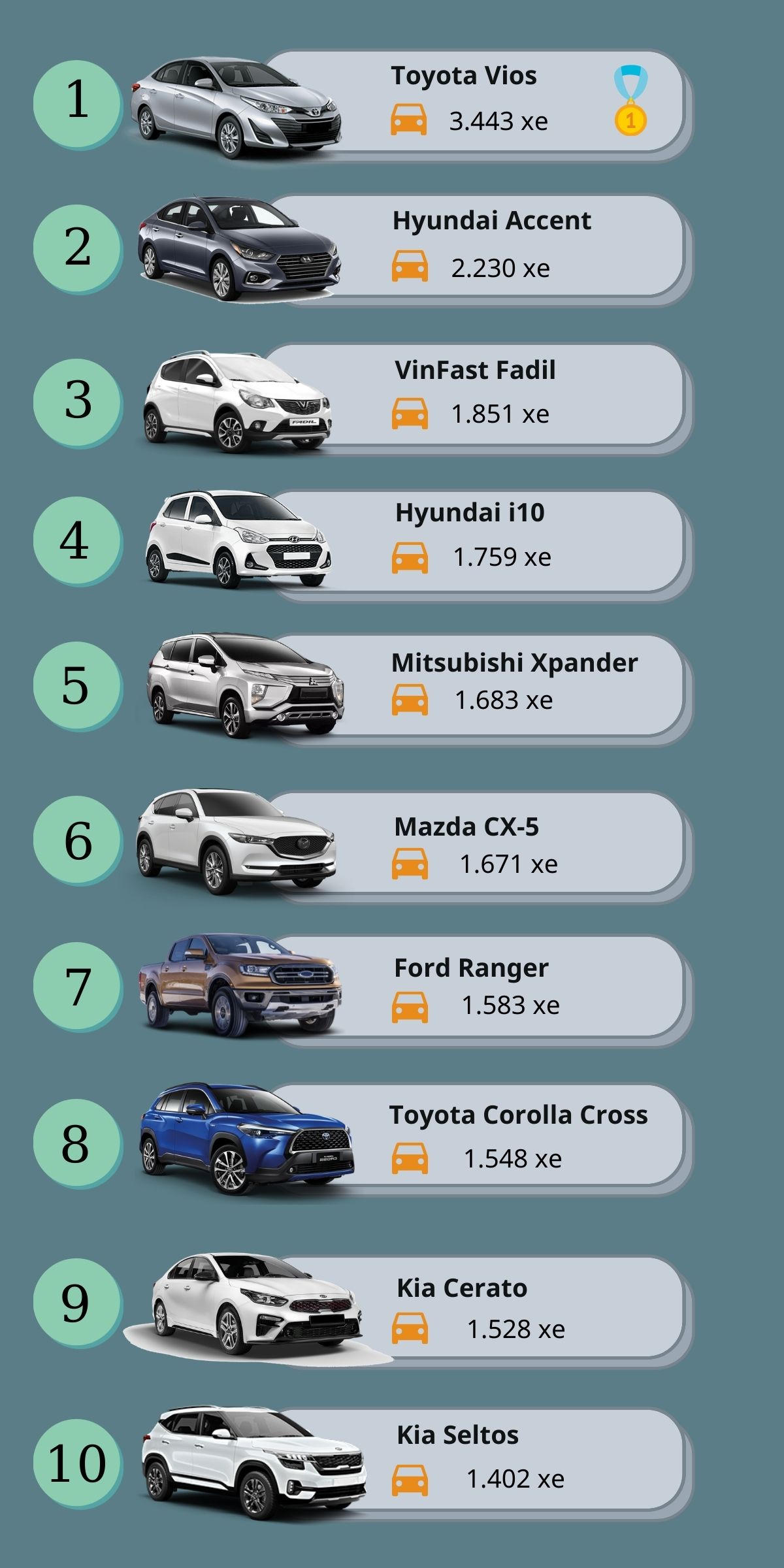 Trong khi đó, Vinfast Fadil đã vươn lên vị trí thứ 3 với 1.851 xe, tiếp tục trở thành mẫu xe bán chạy nhất phân khúc A. Ngay sau Fadil là đối thủ Huyndai i10 khi doanh số đạt 1.759 xe.
