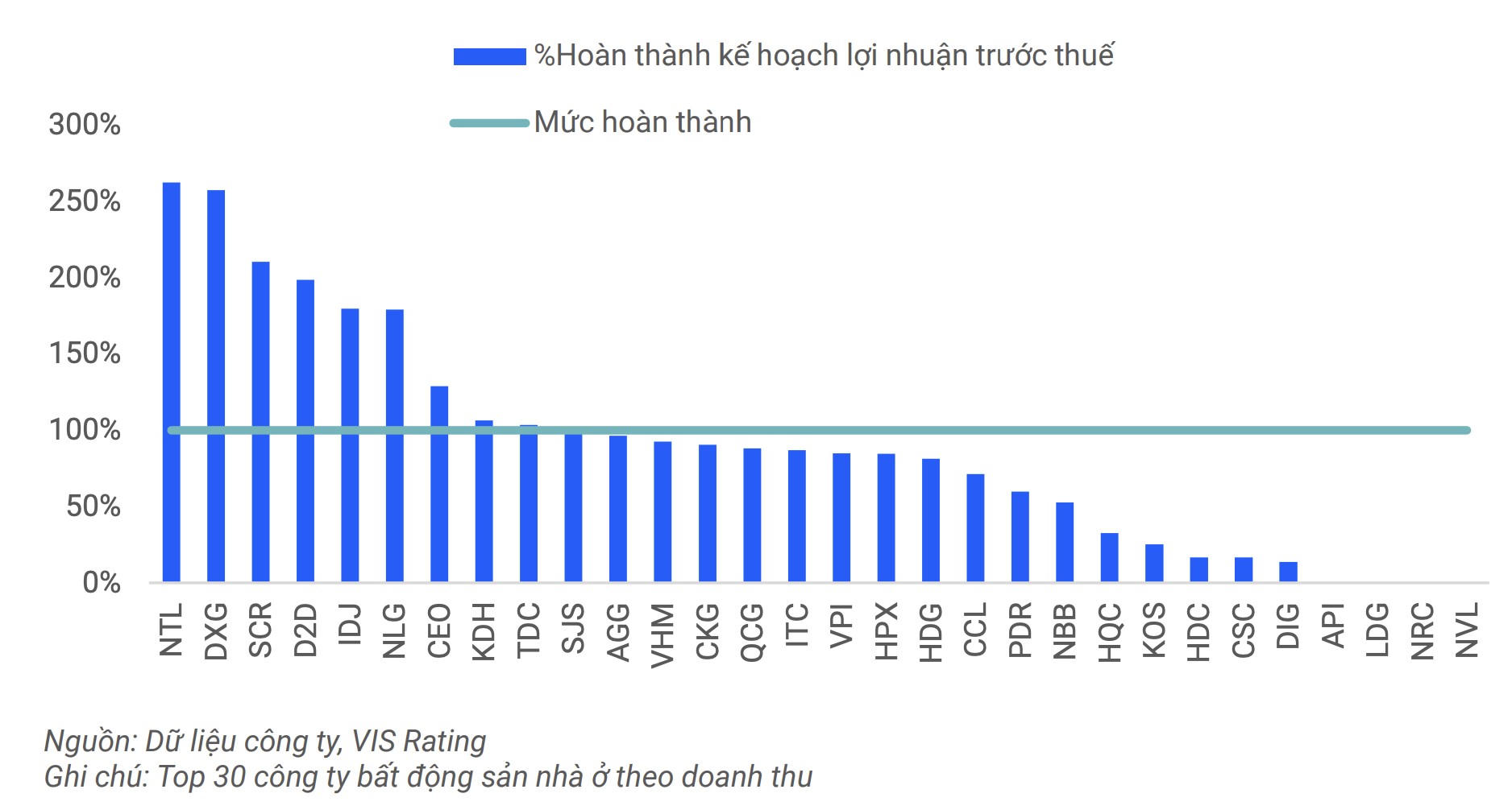 Chỉ có 10 trong số 30 công ty trong danh sách theo dõi của VIS Rating hoàn thành kế hoạch lợi nhuận cả năm 2024. Các chủ đầu tư lớn như Đất Xanh (DXG), Nam Long (NLG) và Vinhomes (VHM) ghi nhận biên lợi nhuận cao hơn sau khi hoàn thành các dự án quan trọng, chủ yếu ở phân khúc thấp tầng.
