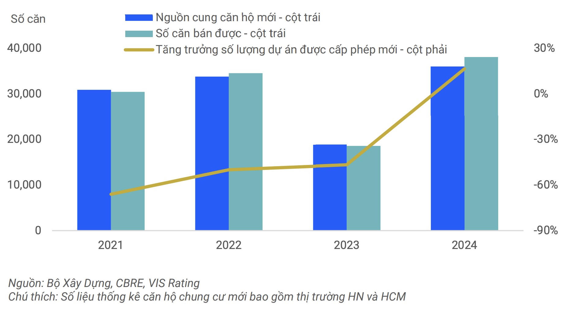 Số liệu của VIS Rating cho thấy, số lượng dự án được cấp phép mới trong năm 2024 đã tăng 16% so với năm 2023. Tại các thị trường lớn như Hà Nội và TP.HCM, nguồn cung căn hộ mới tăng mạnh 90% so với cùng kỳ, trong khi tỷ lệ hấp thụ đạt mức cao nhất trong 5 năm qua, lên tới 106%. Điều này cho thấy nhu cầu của thị trường vẫn rất lớn và các chủ đầu tư đang nỗ lực đáp ứng nhu cầu này.