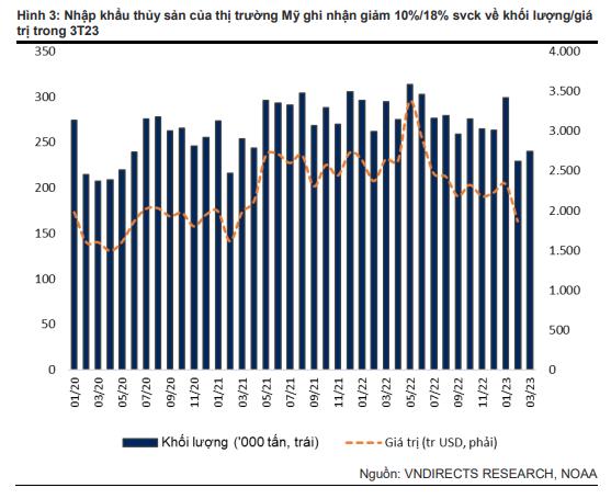 VNDirect cho rằng, tổng khối lượng nhập khẩu thủy sản của thị trường Mỹ sẽ tiếp tục giảm và chỉ có thể phục hồi từ nửa cuối năm nay khi lạm phát và mức tồn kho giảm và nhu cầu cho các kỳ nghỉ cuối năm tăng.